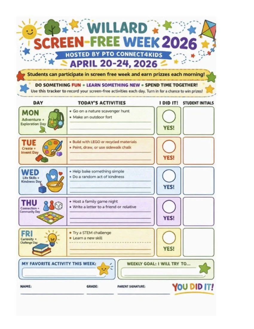 Beginning April 20, the PTO and Connect4Kids is encouraging students to participate in a Screen Free Week in honor of Spring and Earth Day! During this week, students that wish to participate can choose from a menu of non-screen-related activities that will be shared with the students such as nature walks, bike rides, and cooking or baking something at home, and earn prizes for participating!